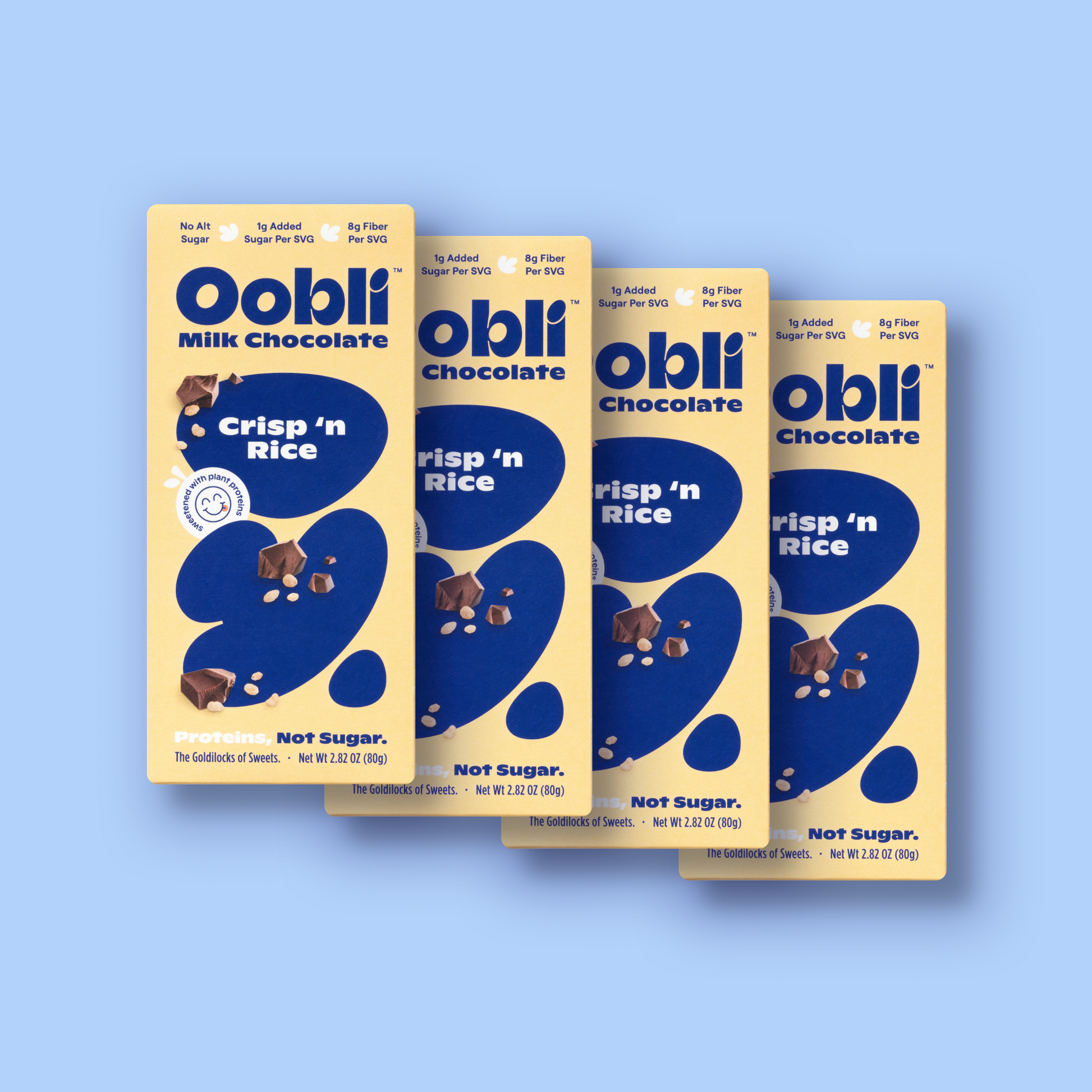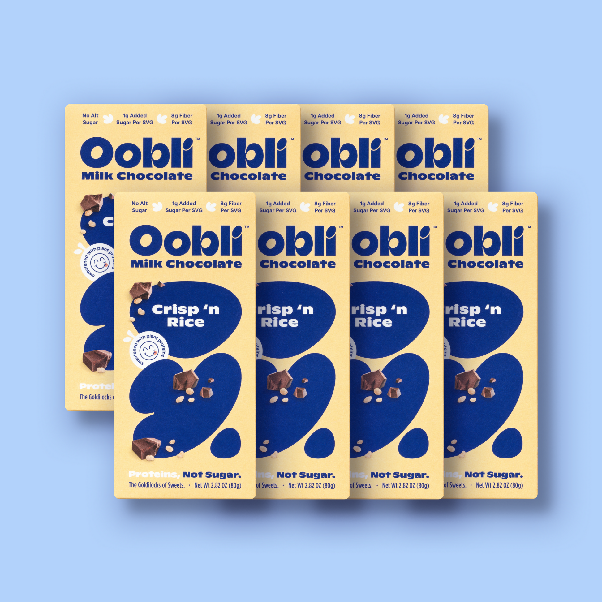 - Milk chocolate and crisp rice, sweetened with ground-breaking Oobli sweet proteins