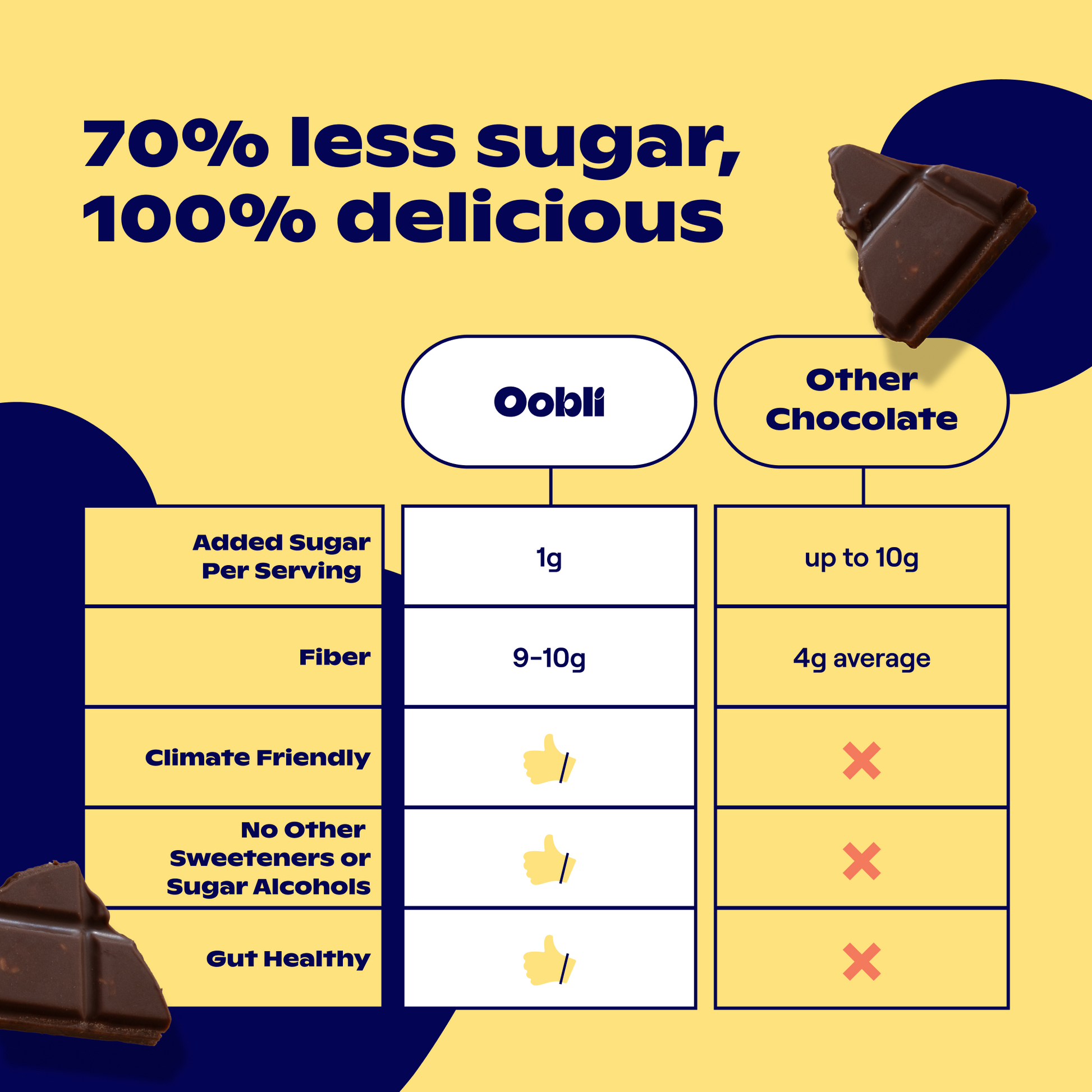 Oobli chocolate is made with a tiny amount of sweet protein that replaces most of the sugar. Sweet proteins don't affect blood sugar, insulin or the gut microbiome, making them a healthy alternative to sweeteners like aspartame, sucralose, stevia and erythritol. High in fiber and keto friendly.