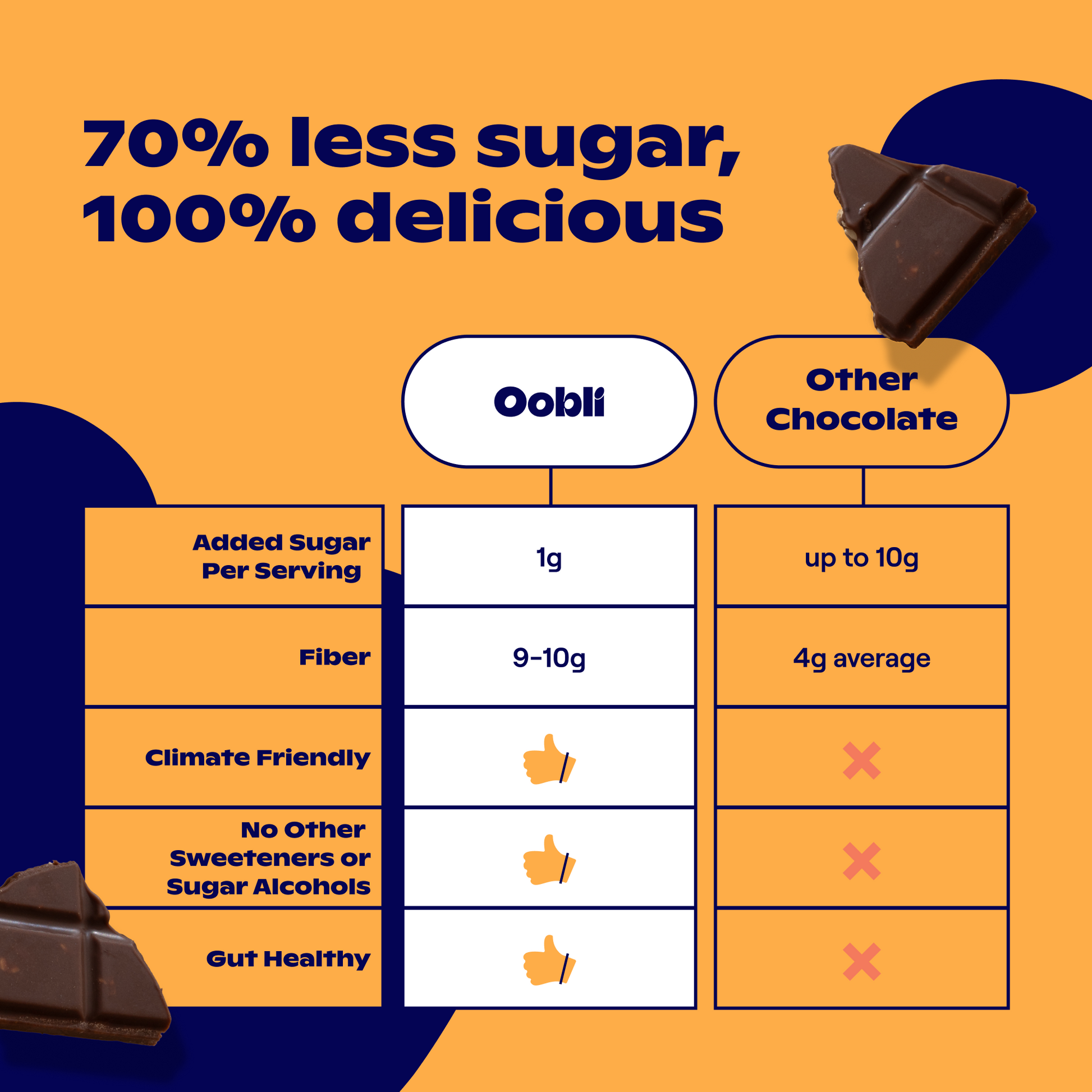 Oobli chocolate is made with a tiny amount of sweet protein that replaces most of the sugar. Sweet proteins don't affect blood sugar, insulin or the gut microbiome, making them a healthy alternative to sweeteners like aspartame, sucralose, stevia and erythritol. High in fiber and keto friendly.